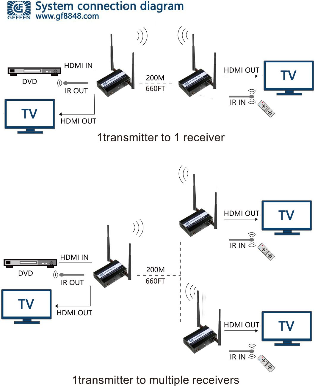 ●IR Remote Control: Please align the IR end of the extender on the transmittingterminal with the IR receiving terminal of the signal source that requires to becontrolled, and make them close to each other.