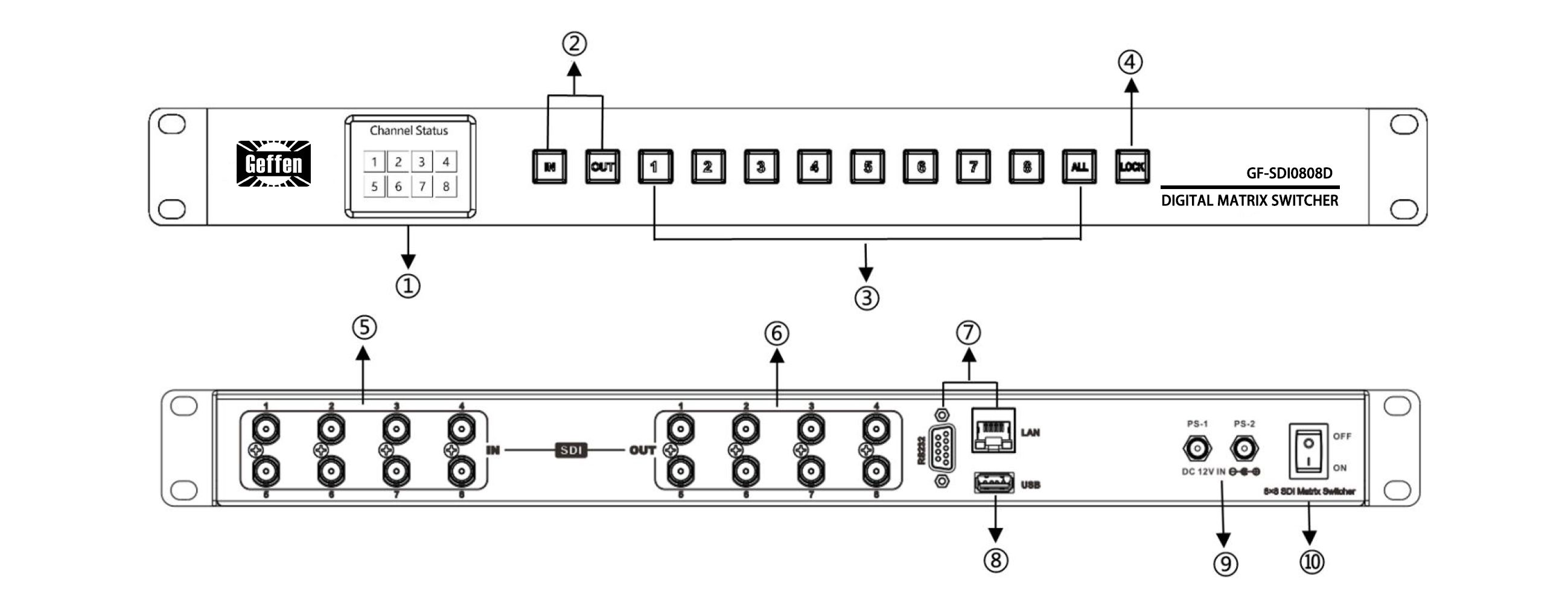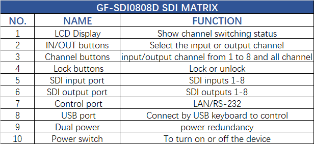 The SDI routing switcher GF-SDI0808D has 8 inputs and 8 outputs, supports standard 3G/HD/SD SDI rates, automatic bypass of non-standard rates between 270Mbit/s and 3Gbit/s, and passes all SDI embedded audio/ancillary data. It can conveniently controlled by front panel button, keyboard via USB and PC software via LAN/RS-232.