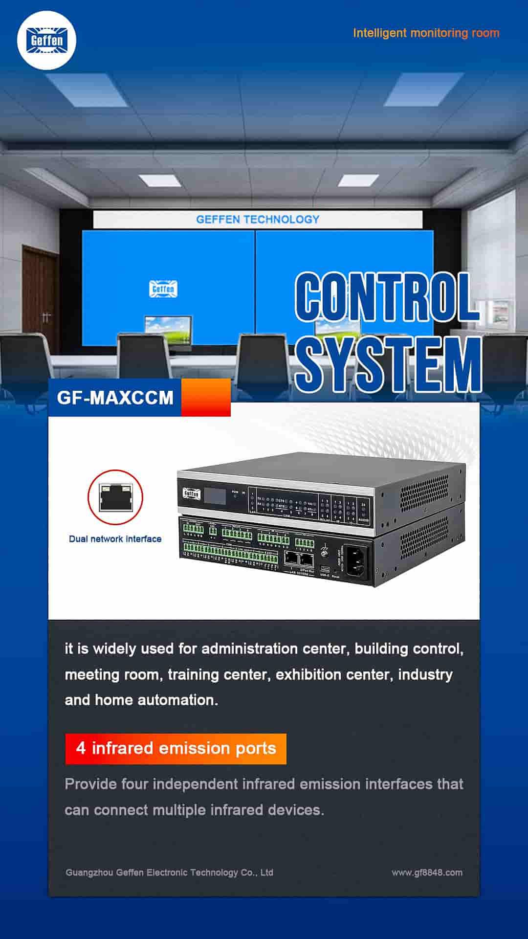 The GF - MAXCC Programmable Central Control System can control a wide range of devices. It can manage audiovisual equipment such as projectors, audio systems, and video conferencing equipment. For example, it can power on/off a projector, switch the input source of an audio amplifier, and start/stop a video conferencing session. In an office meeting room, when a user presses a “Meeting Start” button on the control panel, the central control system can send commands to turn on the projector, set it to the correct input for the laptop connection, and adjust the volume of the speakers to an appropriate level.