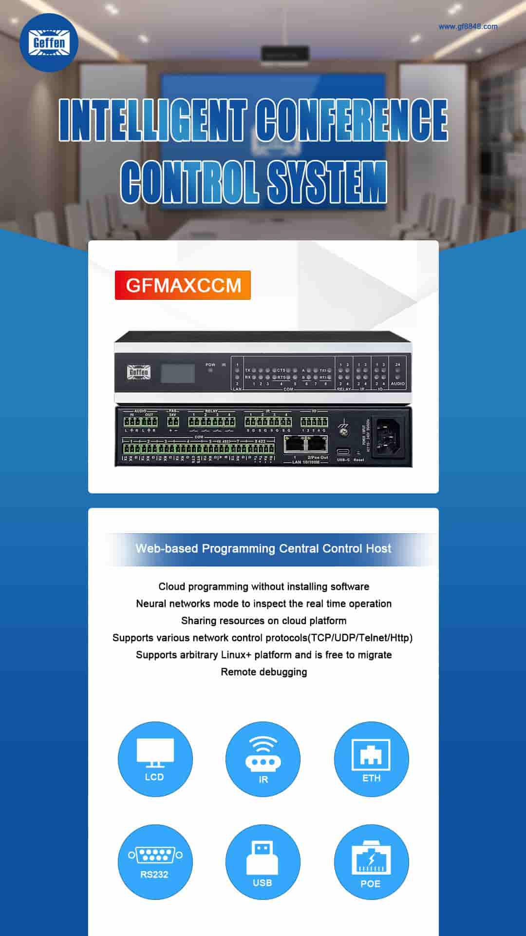 GF - MAXCC プログラム可能な中央制御システムには通常、様々な物理的なインターフェイスがあります。ネットワーク接続用のイーサネットポートを含むことがあります。これらのイーサネットポートによって、システムは他のネットワーク対応機器、例えば IP ベースのカメラ、ネットワークプロトコルをサポートするアクセス制御システム、その他のスマートビル管理機器と通信できます。イーサネットポートのデータ転送速度は機種や設定によって異なり、一般的に 10/100/1000Mbps の速度をサポートします。