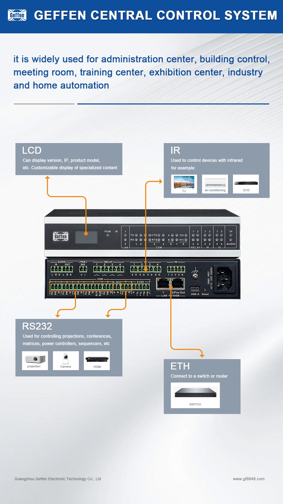 GF - MAXCC प्रोग्रामेबल केंद्रीय नियंत्रण प्रणाली कई प्रकार के उपकरणों को नियंत्रित कर सकती है। यह ऑडियो - विजुअल उपकरणों को प्रबंधित कर सकती है जैसे प्रोजेक्टर, ऑडियो सिस्टम और वीडियो कॉन्फ़रेंसिंग उपकरण। उदाहरण के लिए, यह एक प्रोजेक्टर को चालू/बंद कर सकती है, एक ऑडियो एम्प्लीफ़ायर के इनपुट स्रोत को स्विच कर सकती है और एक वीडियो कॉन्फ़रेंसिंग सत्र को शुरू/रोक सकती है। एक कार्यालय की मीटिंग रूम में, जब एक उपयोगकर्ता नियंत्रण पैनEL पर "मीटिंग स्टार्ट" बटन दबाता है, तो केंद्रीय नियंत्रण प्रणाली प्रोजेक्टर को चालू करने के लिए कमांड भेज सकती है, लैपटॉप कनेक्शन के लिए सही इनपुट पर सेट कर सकती है और स्पीकर की आवाज को एक उपयुक्त स्तर पर समायोजित कर सकती है।