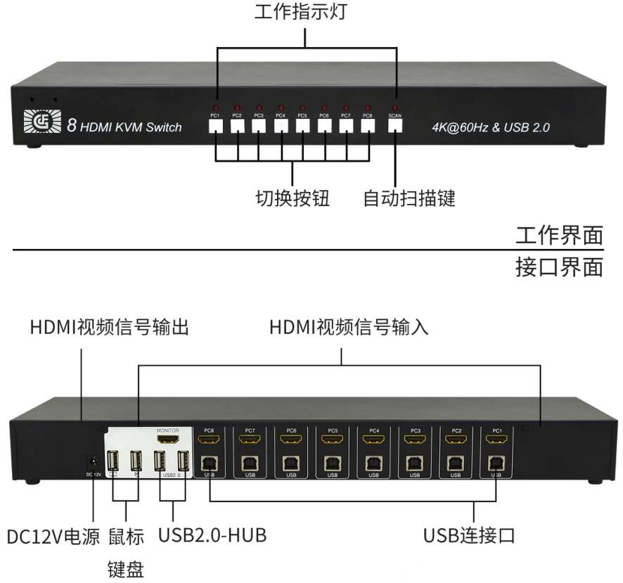 HDMI KVM 8 in 1 out 4K switcher enables users to quickly switch between 2 4 or 8 computer hosts from a single USB keyboard, mouse, and an HDMI video signal interface for efficient multi-tasking.