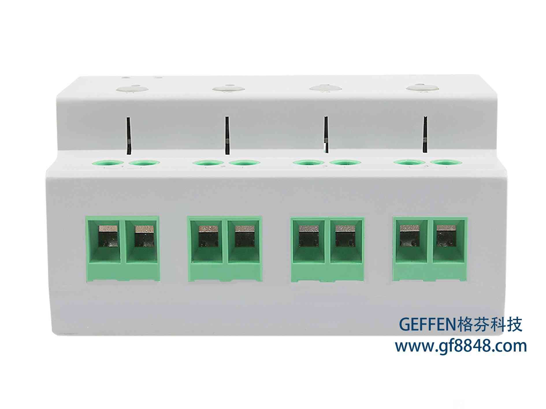 GF-PMG04 is a rail installation, with 4 relay output control, each loop separately controls the switch of 6600W lighting equipment, with the manual control button of each channel, you need to press and hold for 1s to respond, to prevent misoperation, the corresponding LED indicator will show the output status, and it has a switch detection interface corresponding to each channel, and each switch signal can be defined in 3 modes, which are strong cut, strong start, and switch. CAN-BUS bus communication is adopted, and the products need to be connected hand in hand.