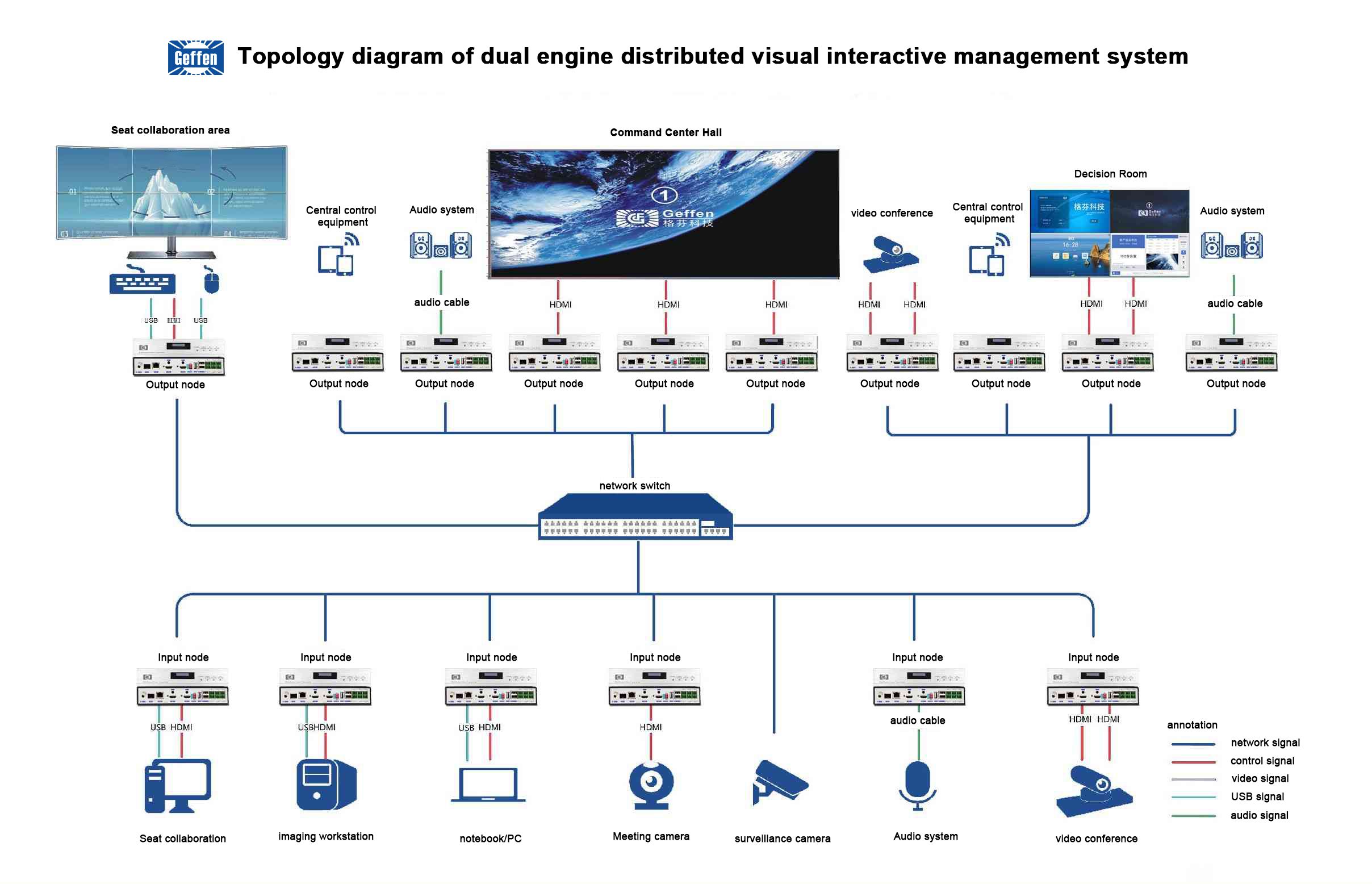 3) Node interface: high-definition video interface (one HDMI input, one HDMI output.), audio input and output interface (Phoenix plug connector), IR, IO and two-way Rs232, Rs485 interface, video loop-out interface, USB interface.