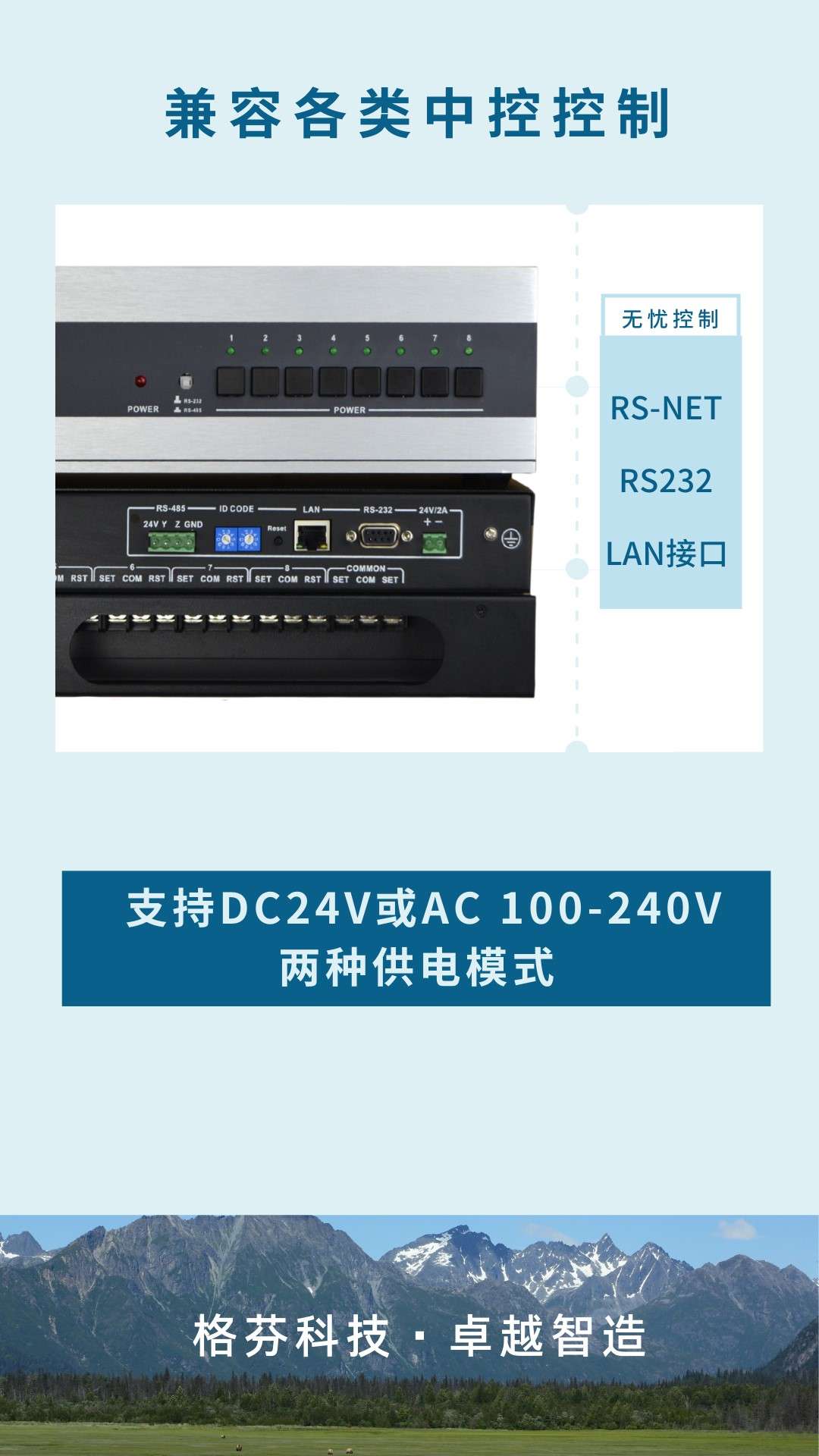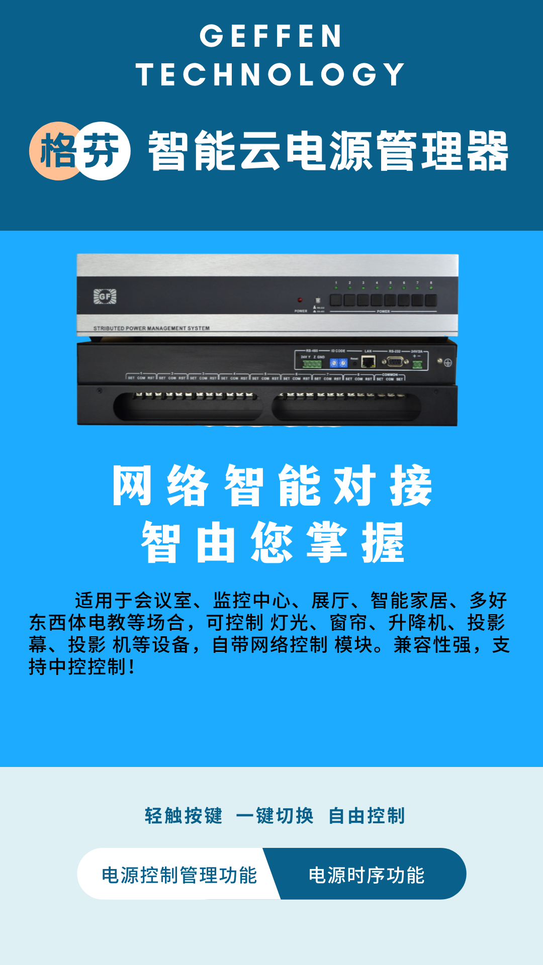 GF-SPMS8 intelligent cloud power manager communicates with the central control host through the LINK protocol or 232 communication protocol, and achieves the purpose of weak current control and strong current through the relay principle, which is mainly used to control equipment switches, projector delay shutdown, electric screen, electric curtain, electric hanger lifting control, etc. The built-in network control function is integrated with the WEB GUI interface, which can be controlled by various mobile devices at any time.