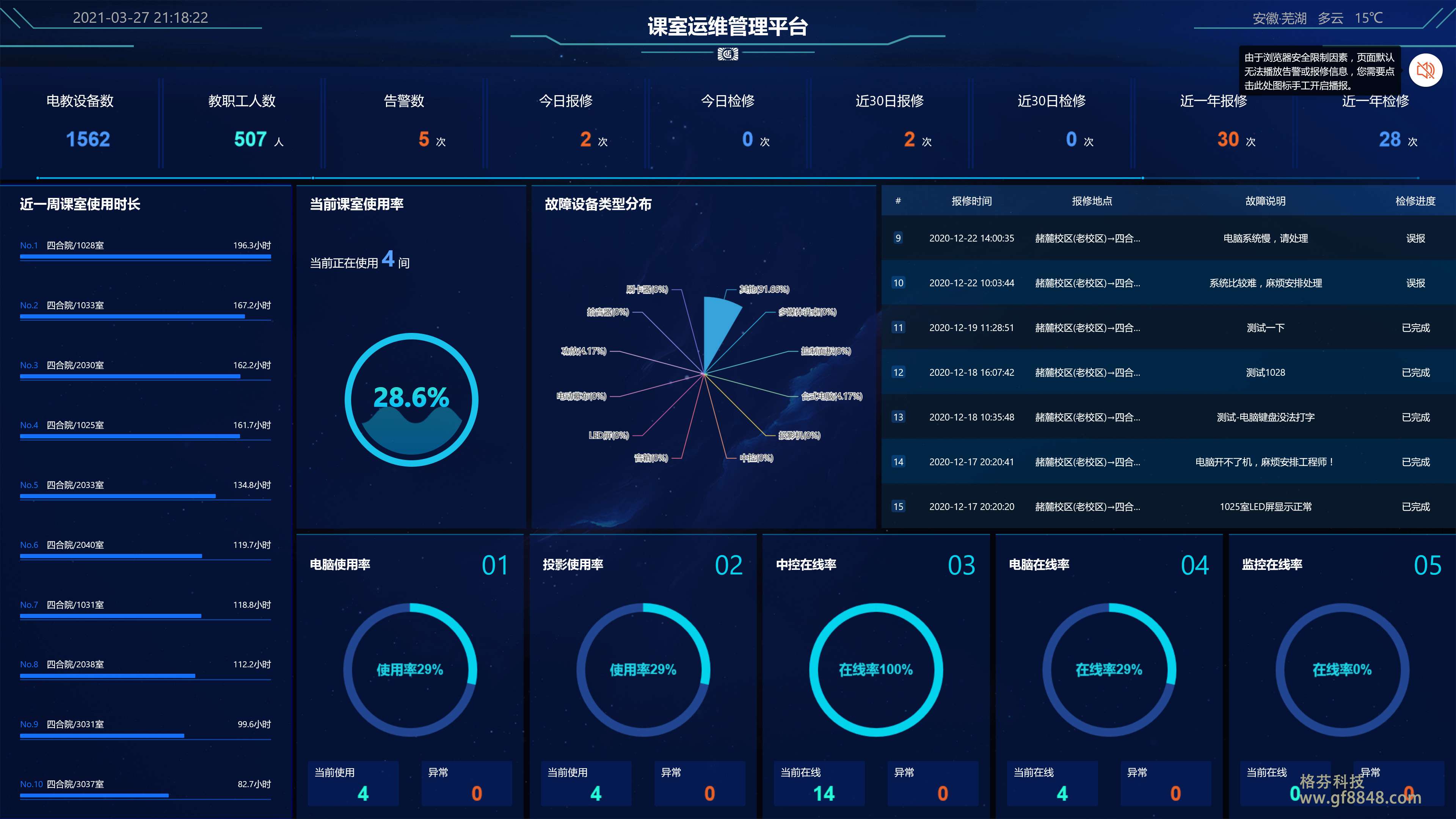 The smart campus IoT management system covers the school's daily work information management, centralized control of the Internet of Things, audio and video broadcasting, information release, operation and maintenance management, etc., Geffen aggregates scattered and heterogeneous applications and information resources, and realizes the seamless access and integration of structured data resources, unstructured documents and Internet resources, and various application systems across databases and cross-system platforms through a unified access portal, so that the school's various businesses can be deeply integrated.