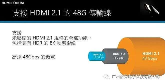 The latest HDMI 2.1 version released in January 2017, the biggest feature of HDMI 2.1 is that the transmission bandwidth has been greatly increased from 18Gbps to 48Gbps, and supports new technologies such as dynamic HDR, audio return channel (eARC), variable refresh rate (VRR), fast media switching (QMS), fast frame transfer (QFT), automatic low latency mode (ALLM), VESA DSC 1.2a and other new technologies. Supports up to 7,680 × 4,320/60Hz (8K/60p), or higher frame rates at 4K/120Hz. HDMI 2.1 will continue to support the original HDMI A, C and D plug designs. In addition, it supports the new Dynamic HDR technology, which can further improve the contrast and light level performance according to the light and dark distribution of each frame compared to the current "Static" HDR. In terms of audio, HDMI 2.1 supports the new eARC technology, which can transmit back object-based sound effects such as Dolby Atmos compared to the existing ARC (Audio Return Channel).