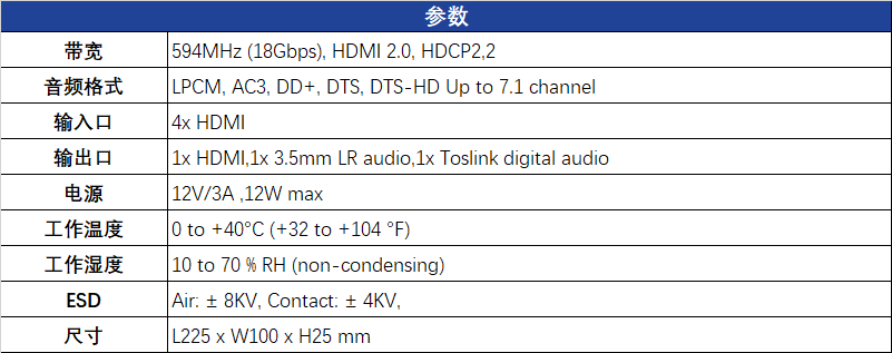 The switcher supports a maximum input resolution of 3840x2160@60, supports a variety of audio formats such as LPCM, AC3,DD+, DTS, DTS-HD, up to 7.1 channels, and supports independent audio selection.
