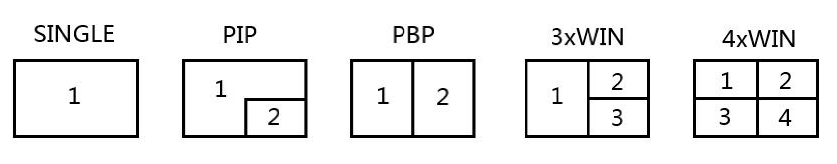 ● 5 window modes, PBP, 3xWIN, 4xWIN, SINGLE, PIP