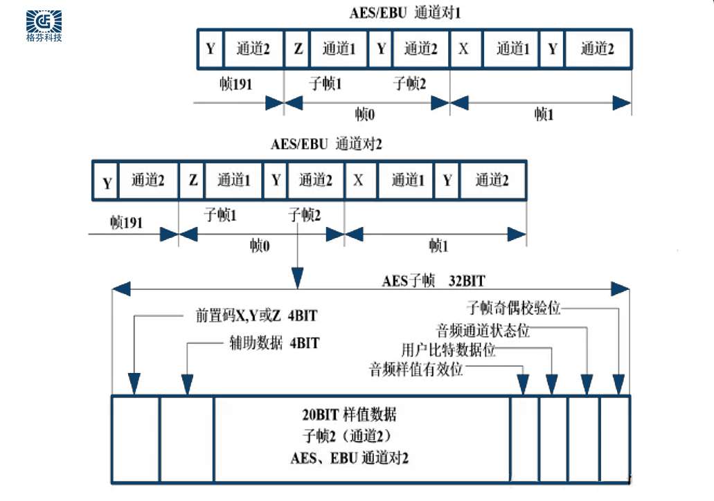Channel data status bit C: AES can transmit mono or stereo audio. In the case of binaural, the channel state of subframe 1 and subframe 2 in any single audio block is different. C generally includes the following information: the number of left and right channels, sampling frequency, time coding, length of sampling words, etc. C is usually used to express some state information about the channel
