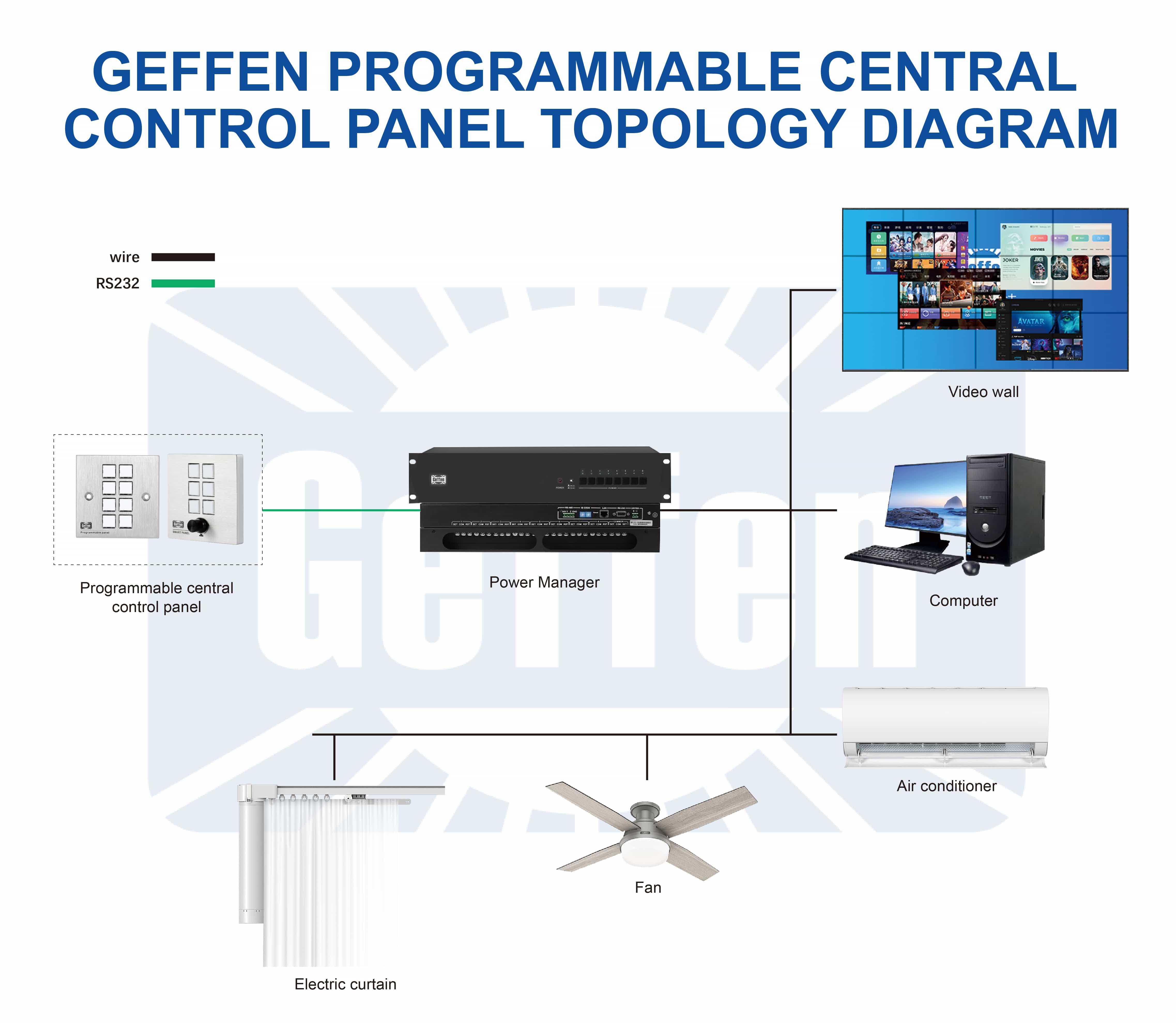 GEFFEN central control series GF-PR6, this customizable control buttonsl panel, has 6 dimmable LED crystal buttons, 1 adjustment knob, each button can be programmed according to the actual situation of the project, and each button can affect each other or be used independently. It has a variety of interfaces: 3 RS232 ports, 1 RS485 port, 3 infrared emission ports, and 2 relay control ports, which are convenient for controlling various devices. It is simple, practical, safe and reliable control mode, and is a good helper for you in conference rooms, exhibition halls, classrooms, multimedia classrooms and other engineering projects.