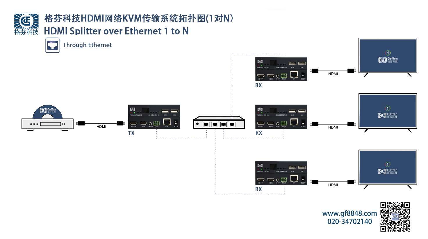 Transmits HDMI video and audio signals up to 150m over a single CAT6 cable;